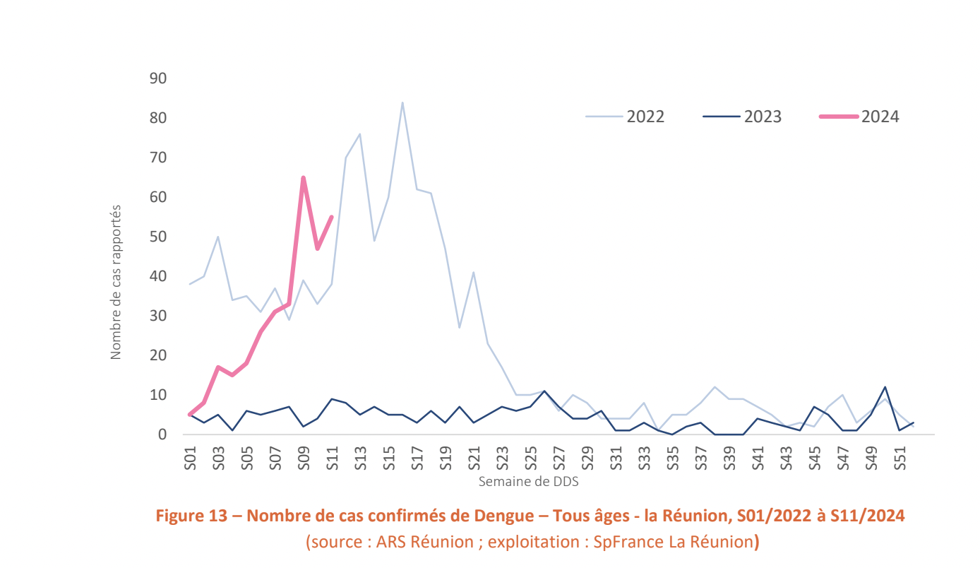 L’impact sanitaire reste à ce jour faible avec 55 passages aux urgences (CHU Sud et CHOR principalement) pour syndrome compatible avec la dengue depuis le début de l’année, dont 9 en S12 et 12 en S12. Depuis 2 semaines, ce nombre est supérieur à 5 passages hebdomadaire. L’impact hospitalier reste faible avec 2 hospitalisations depuis le début de l’année. ERRATUM : le nombre
