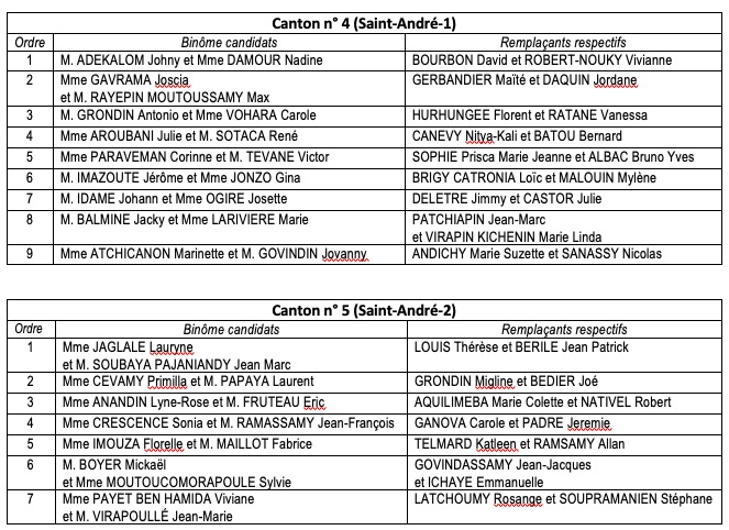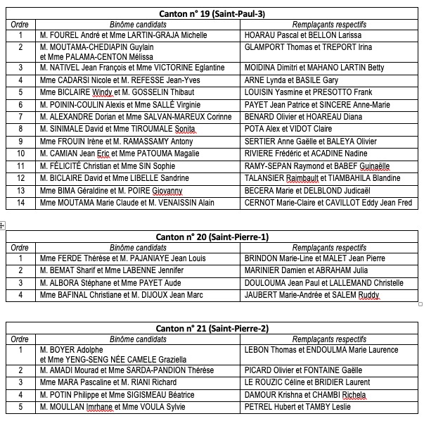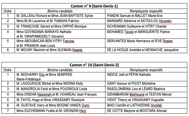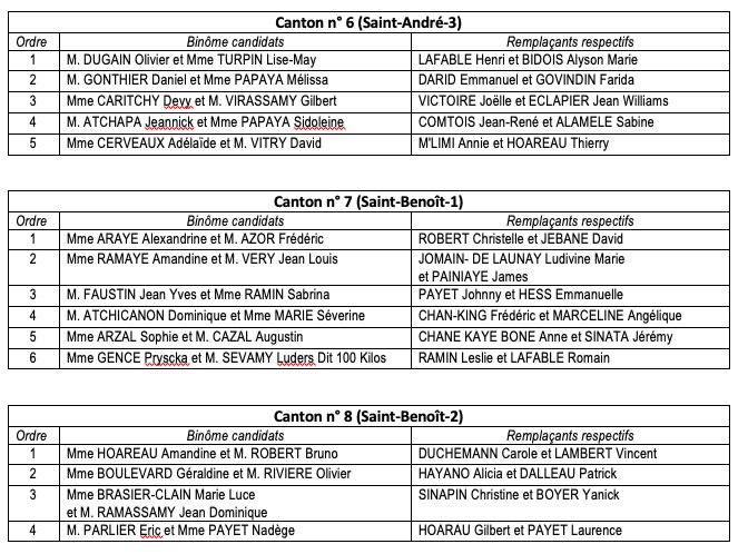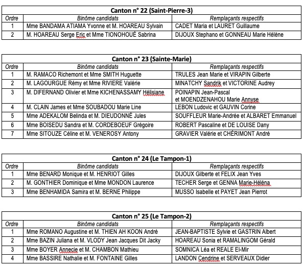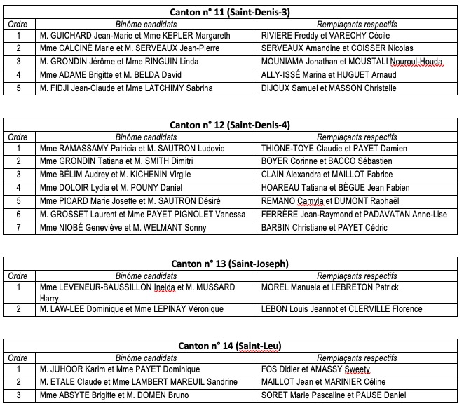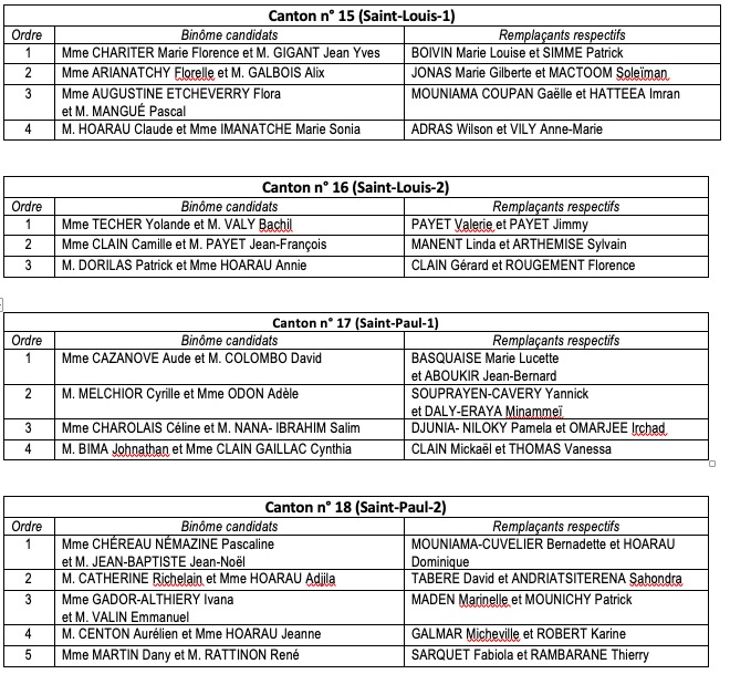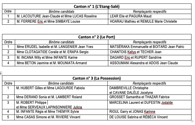 A La Réunion, la liste des 127 binômes de candidats et de leurs remplaçants dans 25 cantons est fixée par l’arrêté n°868/SG/DCL en date du 6 mai 2021. Voici les listes complètes :