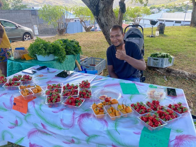 A la veille de la fête des mamans, des agriculteurs et artisans se sont réunis dans le quartier de Mont Roquefeuil à Saint-Paul. L'évènement se tient depuis 8h et ce jusqu'à 18h ce samedi 28 mai. Des fraises péi à 3 euros la barquettes, des chouchous à 0,60 d'euros , ou encore des brèdes à 1,50 euros, sont proposés à la vente. Il s'agit là d'une journée spéciale avec cette animation de quartier. (Photo : 426 PKS - DR)