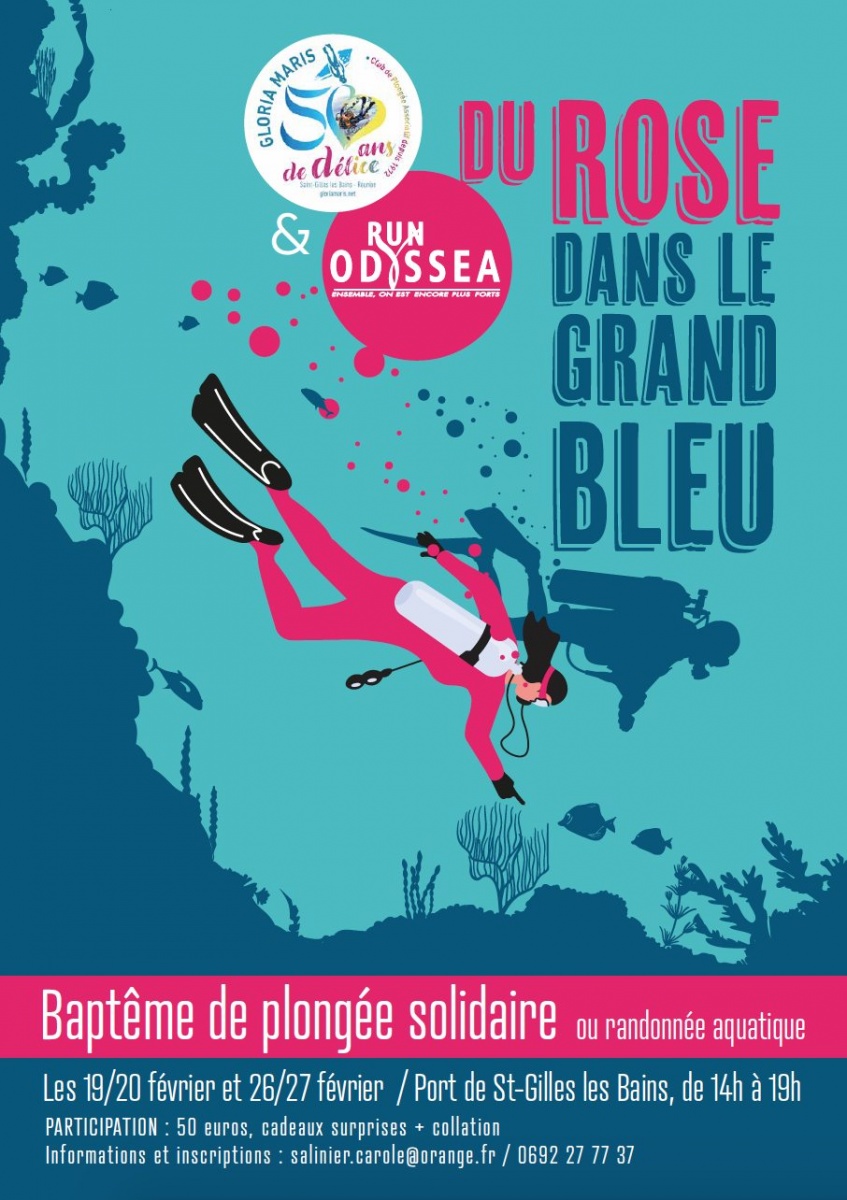 Le club de plongée associatif Gloria Maris, basé sur le port de Saint-Gilles-les-Bains (Saint-Paul), s'associe avec Run Odysséa dans la lutte contre le cancer du sein. Ce samedi 26 février 2022, le club propose des baptêmes de plongée dont une partie des bénéfices reviendra à l'achat de maillots de bain avec des prothèses mammaires, adaptés aux femmes ayant subi une mastectomie. L'opération a été baptisée "Du rose dans le grand bleu", 20 euros seront reversés à Odyssea pour chaque baptême réalisé (Photos mm/www.ipreunion.com)