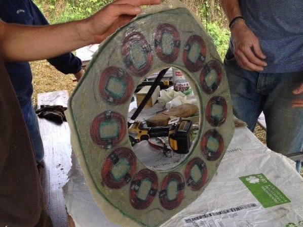 La fabrication de cette éolienne est une opération parallèle à l'action "agriculture bio" à laquelle participent des demandeurs d'emploi. Cinq d'entre-eux construisent le générateur d'énergie verte.