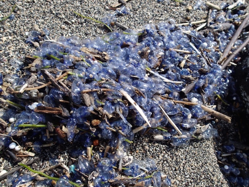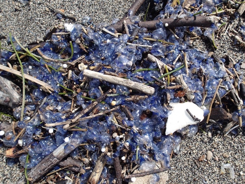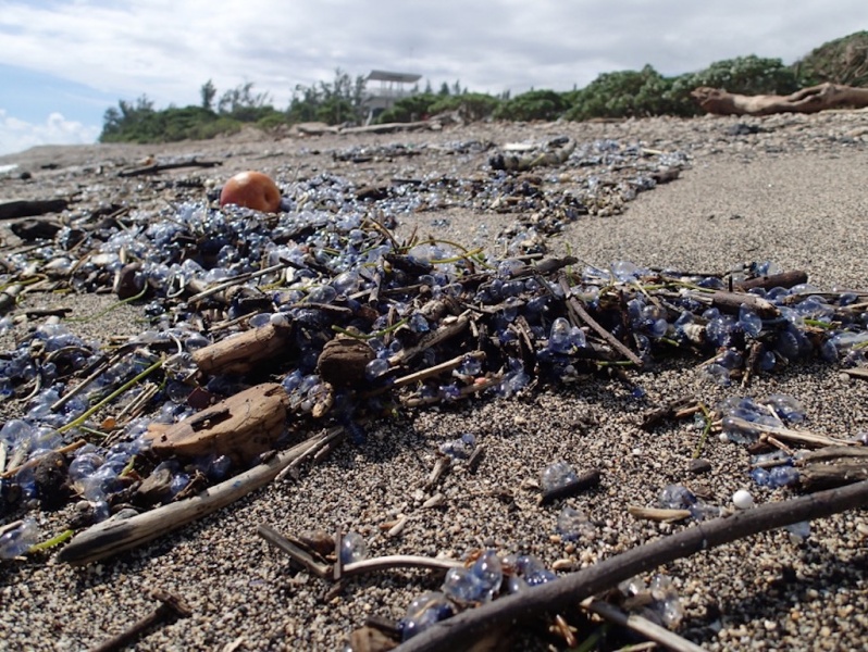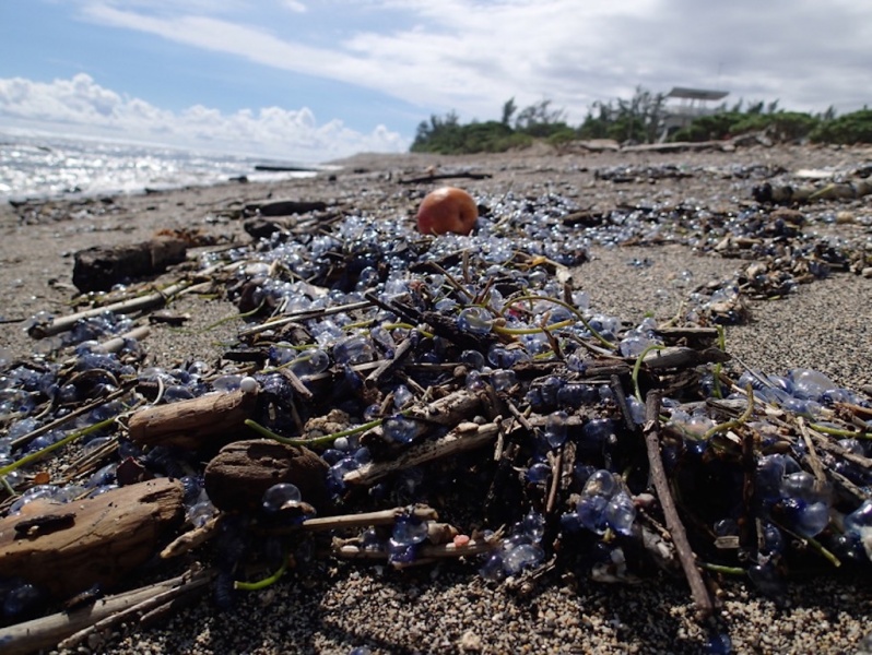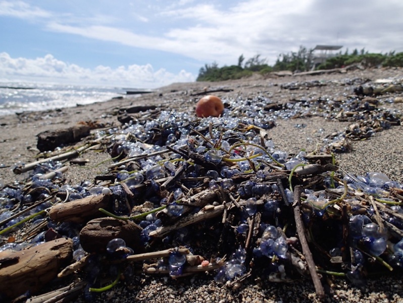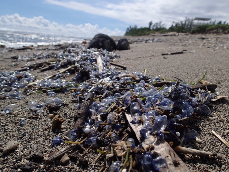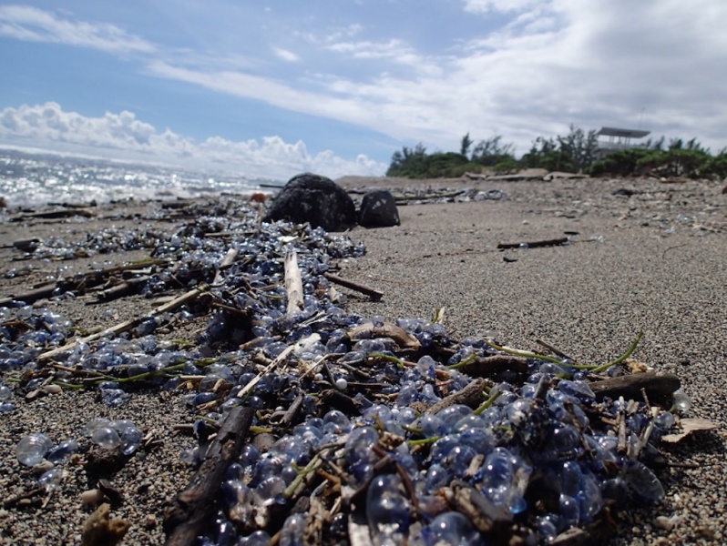 Ce jeudi 8 février 2018, des milliers de physalies se sont échouées sur la plage de Saint-Leu, face au parc Kélonia. Depuis ce matin, le vent du sud les ramène vers la côte. Fausses méduses, elles sont pourtant particulièrement urticantes. La prudence est de mise.