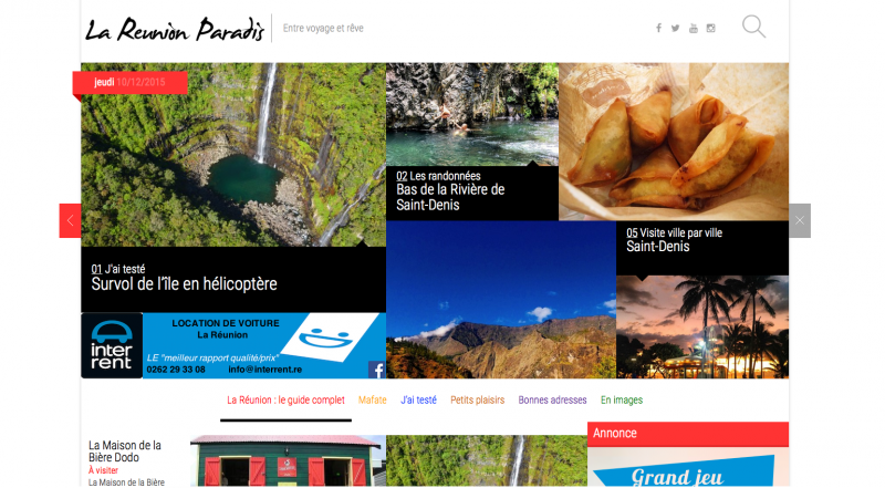 Après s’être construite une forte présence sur Facebook avec 362 850 "like" et sur Instagram avec 6 562 abonnés, et avoir été classée 1ère page de Facebook privée avec autant de "j’aime", La Réunion Paradis lance son site internet. "Cela nous permettra de proposer à nos fans, plus de consistance au niveau des publications, mais aussi les accompagner et les guider dans l’organisation de leur séjour", indique le communiqué.
