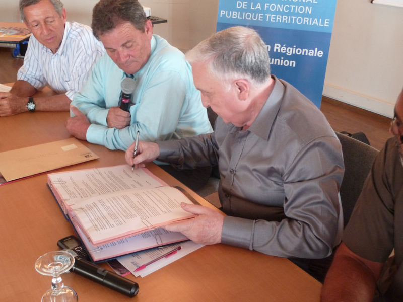 Michel Dennemont, maire des Avirons et délégué du CNFPT (Centre national de la fonction publique territoriale) pour La Réunion, et Roland Robert, maire de La Possession et président de l'Association des Maires du Département de La Réunion ont signé, ce mercredi 27 novembre 2013, une convention de collaboration. Il s'agit, pour les deux parties, de formaliser une collaboration déjà ancienne et de permettre le développement de la formation professionnelle des quelques 20 000 agents communaux et intercommunaux de La Réunion mais aussi celle des élus.