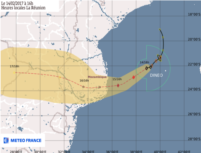 Le système a pris naissance dans le canal du Mozambique au large des côtes sud-ouest de Madagascar. La grande île ne devrait cependant pas être inquiétée. Selon Météo France, Dineo devrait continuer de faire route à l'ouest et se diriger vers la côte sud-est de l'Afrique.