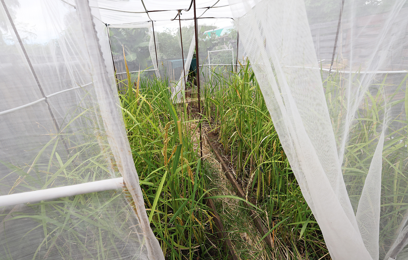 La parcelle de 8m2 est coiffée d'une toile anti-insectes mais aussi anti-oiseaux (ils en sont friands) et à l'intérieur une petite cinquantaine de pied de riz (non, on ne parle pas du mari ou de l'épouse fortuné) se tient bien droit avec, pour encore quelques uns d'entre eux, au bout de la tige, des épis de riz dorés.