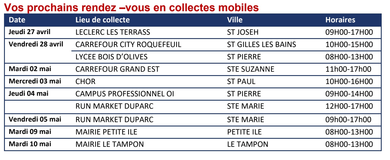 Un appel à la mobilisation est lancé par l'Établissement Français du sang (EFS) de La Réunion pour répondre au mieux aux besoins des malades avant le mois de mai, un mois pendant lequel les collectes de sang seront fortement impactées par plusieurs jours fériés. Après un pic de mobilisation en début d'année, le nombre de donneurs est en baisse depuis plusieurs jours.
