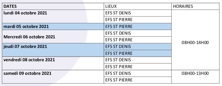 Suite aÌ un manque de ressources, nous sommes contraints de reÌameÌnager nos ouvertures de sites fixes pour le mois dâoctobre. Retrouvez ci-dessous le planning des ouvertures des sites fixes de St Denis et de St Pierre du lundi 04 octobre au samedi 09 octobre 2021.