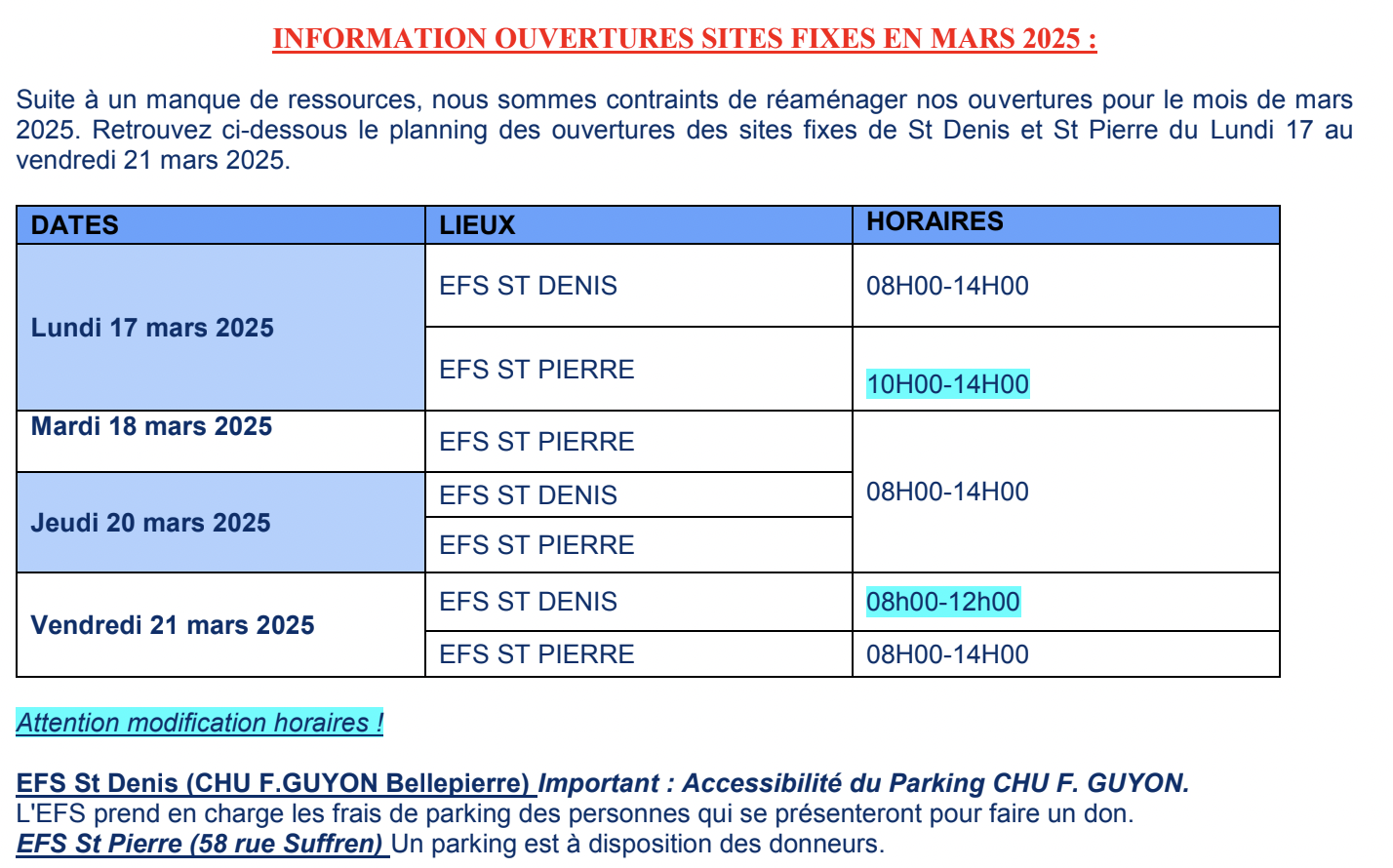 L'Etablissement Français du Sang La Réunion- Océan Indien vous informe des collectes de sang organisées du lundi 17 au samedi 22 mars 2025.