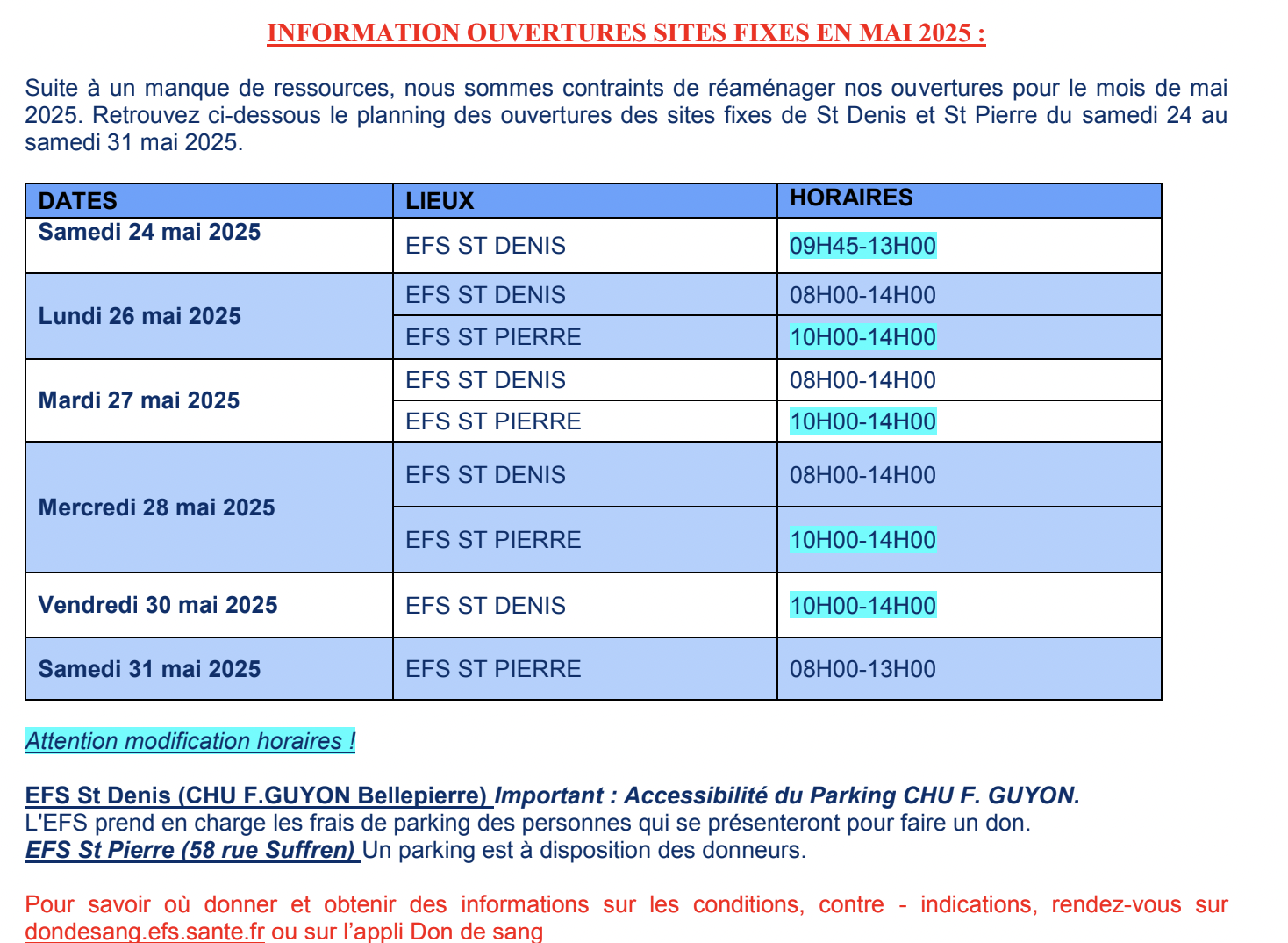 EFS de Saint-Pierre, 58 rue Suffren de 08h00 à 13h00