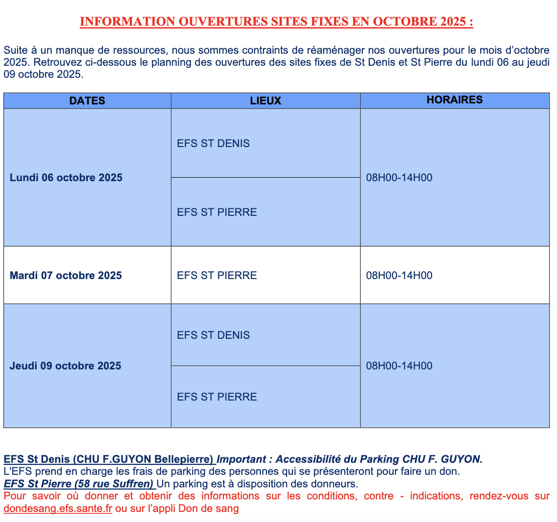 L’Établissement Français du Sang La Réunion- Océan Indien vous informe des collectes de sang organisées du lundi 06 au samedi 11 octobre 2025 (Photo : rb/www.imazpress.com)