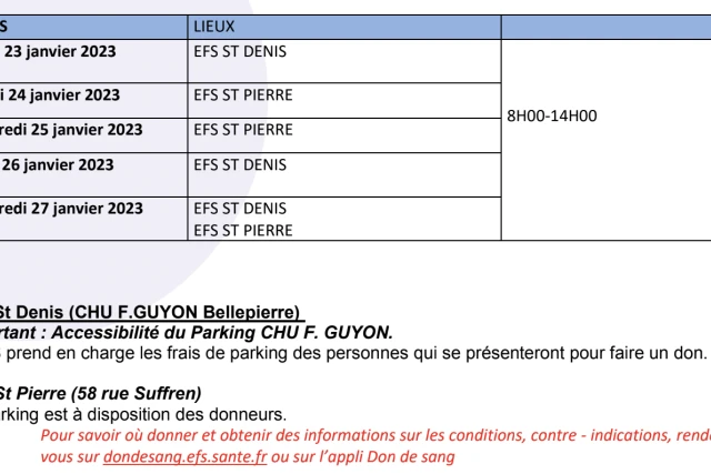 L'Etablissement Français du Sang La Réunion- Océan Indien vous informe des collectes mobiles de sang organisées du lundi 23 janvier au samedi 28 janvier 2023. Nous publions ci-dessous le communiqué de l'EFS.