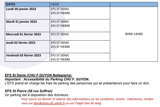 L’Établissement Français du Sang La Réunion- Océan Indien vous informe des collectes mobiles de sang organisées du lundi 30 janvier au samedi 4 février 2023. Nous publions ci-dessous le communiqué de l’EFS.