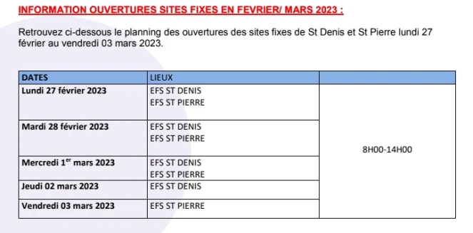 L’Etablissement Français du Sang La Réunion-Océan Indien informe des collectes mobiles de sang organisées du mercredi 1er mars au samedi 4 mars 2023.