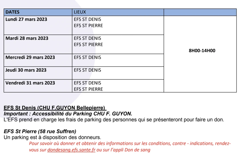 L’Établissement Français du Sang La Réunion- Océan Indien vous informe des collectes mobiles de sang organisées du lundi 27 au vendredi 31 mars 2023.
