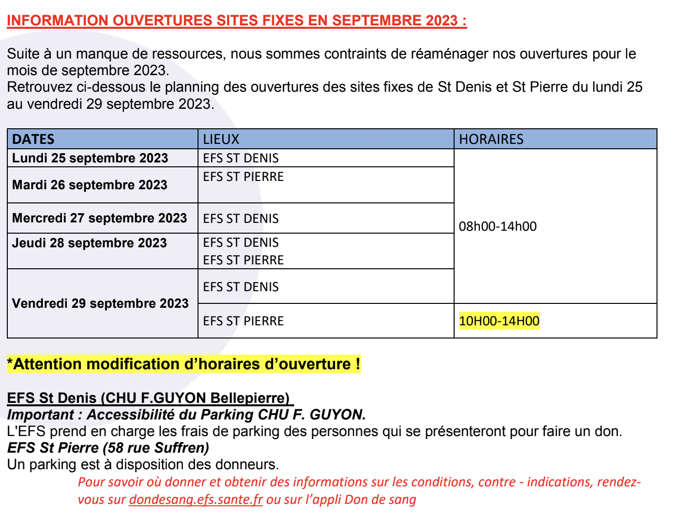 L'Etablissement Français du Sang La Réunion- Océan Indien vous informe des collectes de sang organisées du dimanche 24 au samedi 30 septembre 2023.