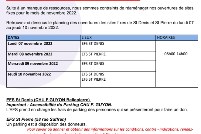 L'Etablissement Français du Sang La Réunion- Océan Indien vous informe des collectes mobiles de sang organisées du lundi 7 novembre au jeudi 10 novembre 2022. Nous publions ci-dessous le communiqué de l'EFS. (Photo d'illustration : rb/www.imazpress.com)