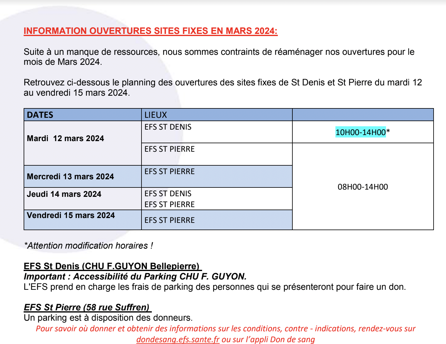 L'Établissement français du sang la réunion - océan indien vous informe d'un report à une date ultérieure de la collecte de sang organisée ce vendredi 15 mars 2024 à la Maison pour tous de Jean Petit (Photo : rb/www.imazpress.com)