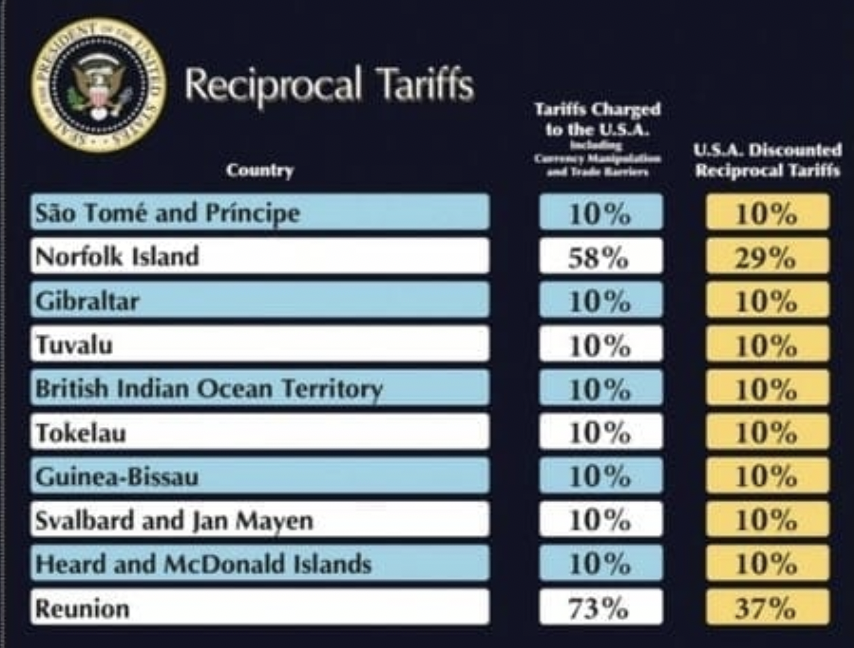 Selon un tableau de la Maison Blanche récapitulant les nouvelles surtaxes douanières américaines, les départements et territoires ultramarins français vont être soumis dans les prochains jours à des niveaux de taxation individuels, bien différents des 20% qui vont s’appliquer à l’UE.