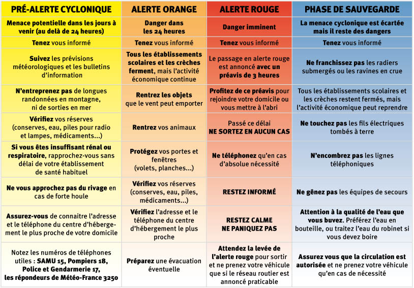 Depuis 18 heures ce vendredi 2 mars, La Réunion est placée en pré-alerte cyclonique. A ce stade, il est recommandé de se tenir régulièrement informé sur l’évolution du phénomène. Il est conseillée de ne pas entreprendre de longues randonnées en montagne ou des sorties en mer et de vérifier ses réserves : conserves, eau en bouteille, piles, médicaments pour les personnes en cours de traitement médical. En cas de houle, il est recommandé de ne pas s'approcher du rivage. Les insuffisants rénaux et respiratoires sont invités à contacter leur établissement de santé habituel.