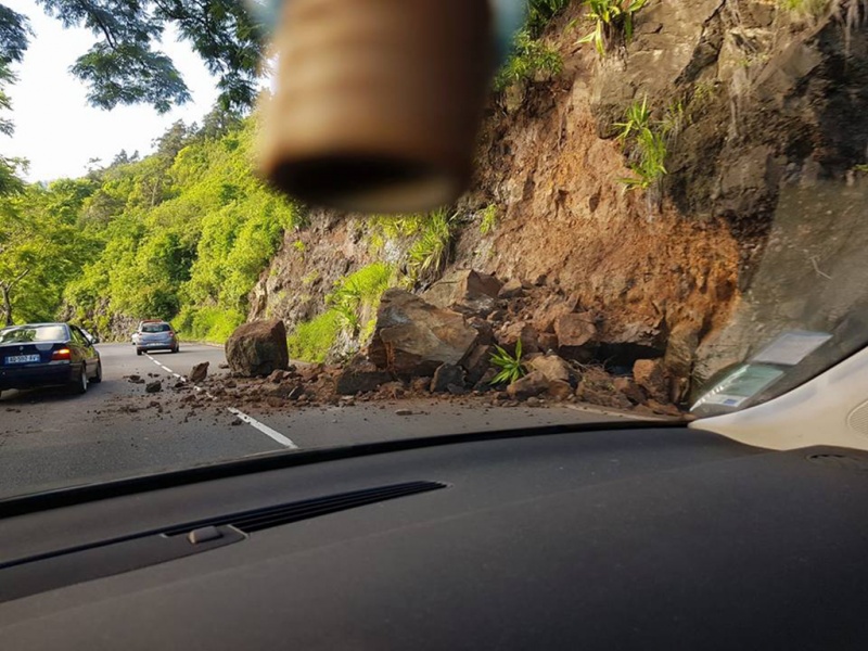 Ce samedi 27 janvier 2018 en début de matinée, un éboulement s'est produit sur la route de la Montagne sur la voie côté de droite dans le sens descendant (vers Saint-Denis). Un éboulis a coupé la voie sur quelques mètres au début des rampes. (photo radar974)