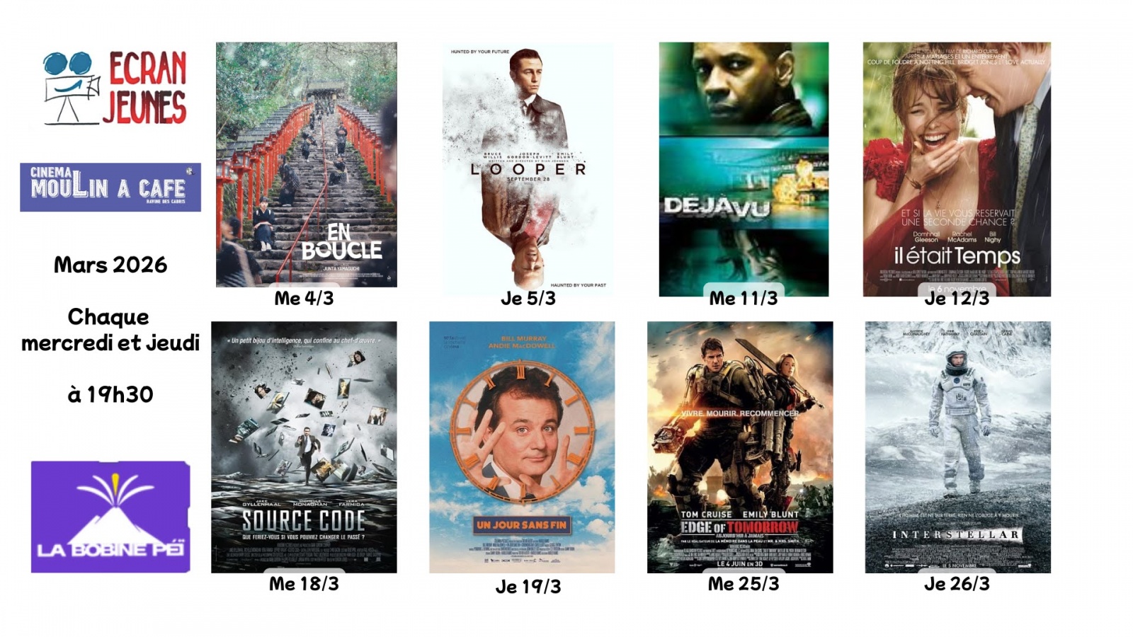 Vivez la sortie de huit films, une sortie chaque mercredi et jeudi durant ce mois de mars : "En boucle", "Il était temps", Source Code".