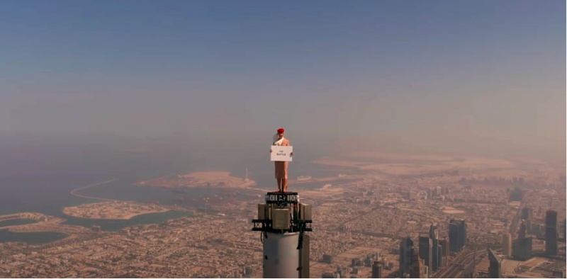 Insolite et vertigineux, les Emirates n'ont pas peur du vide. "I'm in top of the world"("je suis au sommet du monde") s'exclame "l'hôtesse" engagée spécialement pour la publicité de la compagnie aérienne Emirates. La jeune femme s'est posée à 828 mètres de hauteur.