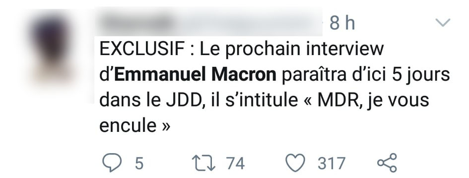 Sur Twitter, le hashtag #MacronDestitution est en tendance numéro 1 depuis ce mardi soir, moment où l’interview a été publiée. En l’espace de quelques heures, pas moins de 75.000 tweets on était envoyés, la très grande majorité pour dénoncer cette énième déclaration. Entre appels à manifester et à destituer le Président, Emmannuel Macron aura en tout cas réussi à rassembler la population…contre lui. Certains ont opté pour l'humour face à cette situation absurde.