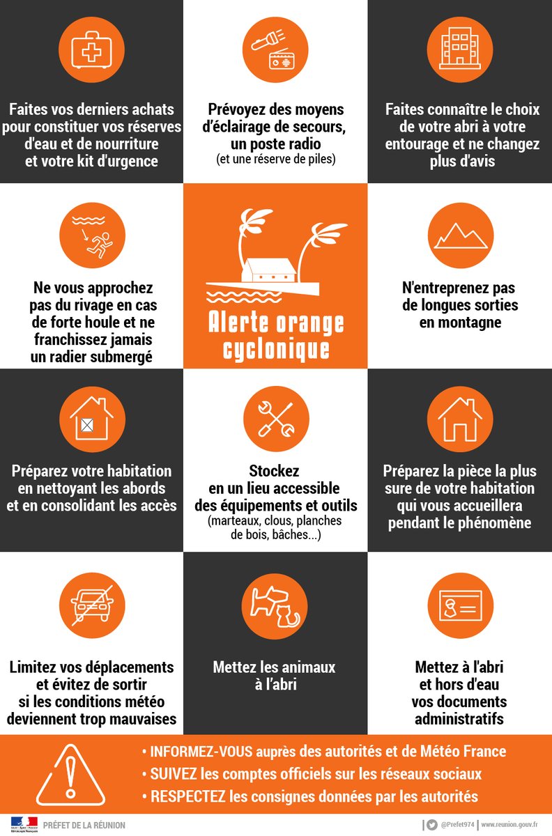 • La vie économique de l’île n’est pas interrompue par le niveau orange de l’alerte cyclonique. Néanmoins, les employeurs sont invités à prendre en compte cette alerte et à limiter autant que possible les déplacements de leurs collaborateurs et salariés.