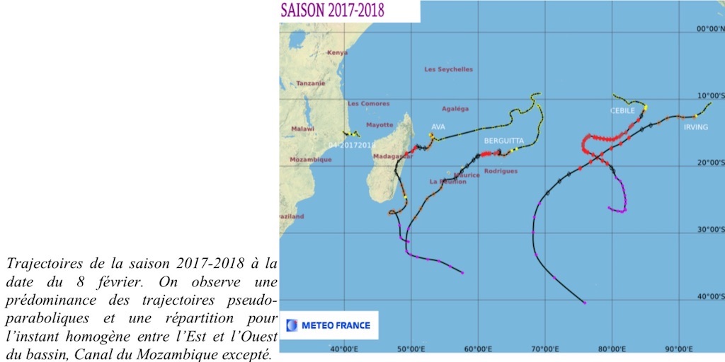On note également qu’une dépression tropicale (n°04-20172018) s’est formée le 15 janvier dans le canal du Mozambique et a rapidement touché terre sur le Nord du Mozambique dans la nuit du 15 au 16 apportant des fortes pluies sur une partie du Mozambique et du Malawi. Les 4 systèmes baptisés ont tous atteint le stade de cyclone tropical et deux d’entre eux ont même atteint le stade de cyclone tropical intense (Berguitta et Cebile).