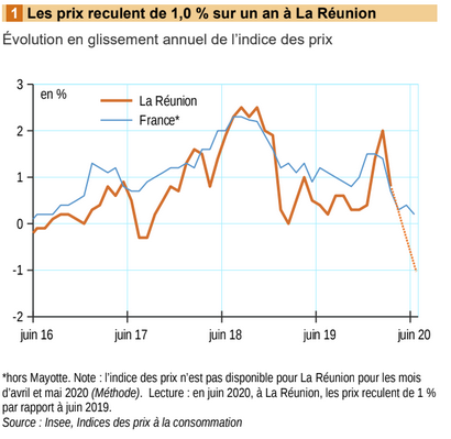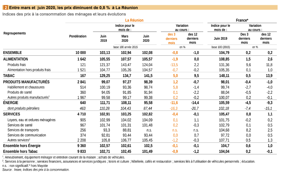 En juin 2020, à La Réunion les prix à la consommation reculent de 0,8 % par rapport à mars 2020. Les prix de l’énergie reculent fortement, accompagnés de la baisse des prix des produits alimentaires et des services. À l’inverse, les prix des produits manufacturés et du tabac augmentent. Sur un an, les prix reculent de 1,0 % à La Réunion, alors qu’ils augmentent de 0,2 % en France, hors Mayotte