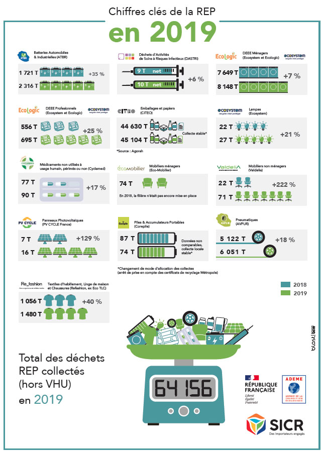 En 2019, le volume pris en charge par les filières REP s’établit à hauteur de 64 156 tonnes contre 48 645 tonnes en 2018 (hors véhicules hors d’usage). Les performances sont variables d’une filière à l’autre. En tête de peloton, nous retrouvons naturellement Citero avec les déchets d’emballages et papiers (45 104 T) ; Ecosytem et Ecologic pour les déchets d’équipements électriques et électroniques - DEEE ménagers (8148 T / +7 %) ; Avpur pour les pneumatiques (6051 T / +18 %) ; ATBR pour les batteries automobiles et industrielles (2316 T / +35 %) ; Re_fashion (ex Eco TLC) pour les textiles d’habillement, linge de maison et chaussure (1480 T/ +40 %) ; Ecosytem pour les déchets professionnels (695 T / +25 %) et les lampes (27 T / +21 %) ; Valdelia pour les mobiliers non ménagers (71 T / + 222 %) ; Cyclamed pour les médicaments non utilisés à usage humain, périmés ou non (90 T / +17 %) ; Corepile pour les piles & accumulateurs portables (74T) ; PV cycle pour les panneaux photovoltaïques (16 T/+129%) et Dastri pour les déchets d’activités de soins à risques infectieux (10 T/ +6%).