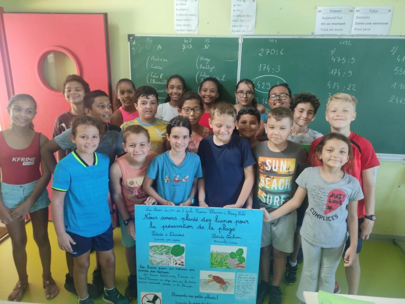 "Il y a à peine deux semaines, une classe d'élèves de CM2 a participé avec beaucoup d'engouement à la plantation de lianes pour lutter contre l'érosion de la plage de Ravine Mulla à Etang Salé, et a créé et implanté deux panneaux de sensibilisation pour sensibiliser sur l'action réalisée et son objectif.