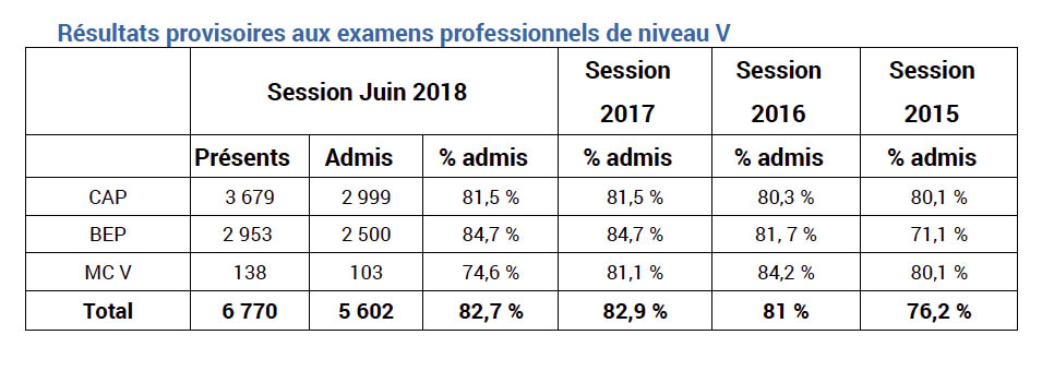 • 3 679 candidats se sont présentés à l’examen final du certificat d’aptitude professionnelle (CAP) et 2 999 ont été admis. Le taux de réussite s’élève à 81,5 %, identique au niveau historique atteint en 2017 (qui avait enregistré une augmentation de 1,2 point après une période de stabilité depuis 2013).