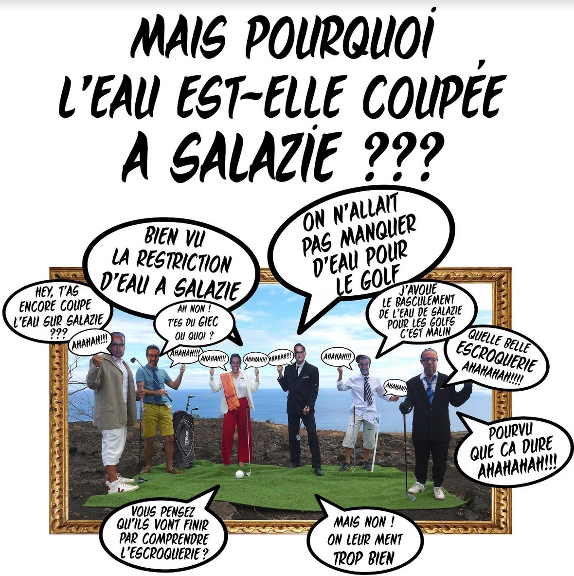 La CISE a également annoncé une coupure d'eau dans une bonne partie du cirque de Salazie de 22h à 5h du matin jusqu'à nouvel ordre ... Les habitants du cirque le plus arrosé de l'île apprécieront très certainement d'avoir le robinet coupé alors que les hôtels et golfs de la côte Ouest peuvent continuer à remplir leur piscines et plans d'eau pour assurer des activités de loisir non essentielles. Ces habitants peuvent remercier le basculement des eaux qui permet depuis 2014, de prélever une partie de l'eau de Salazie pour alimenter les activités industrielles, économiques, agricoles, ainsi que les zones résidentielles de la côte Ouest.