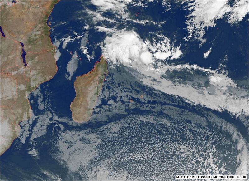 "Pour les cinq prochains jours, le risque de formation d'une tempête tropicale modérée au Nord-est de Madagascar est faible jeudi et vendredi" relatent le CMRS et Météo France dans leur bulletin quotidien. En effet, une zone perturbée a été observée, cependant "au cours des prochaines heures, la très grande taille de la circulation interne de ce système favorisant la présence de multiples vortex en son coeur est un facteur défavorable à une intensification significative" indique le bulletin. (Photo Mtotec)