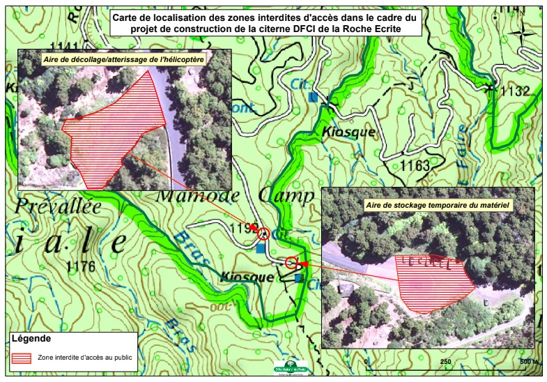 ARTICLE 2 Deux zones situées à l'extrémité . la Route Forestière (voir carte en pièce jointe) sont Concernées, une zone pour le stockage temporaire du matériel avant héliportage sur la zone de travaux et une zone pour le décollage et l'atterrissage de l'hélicoptère.