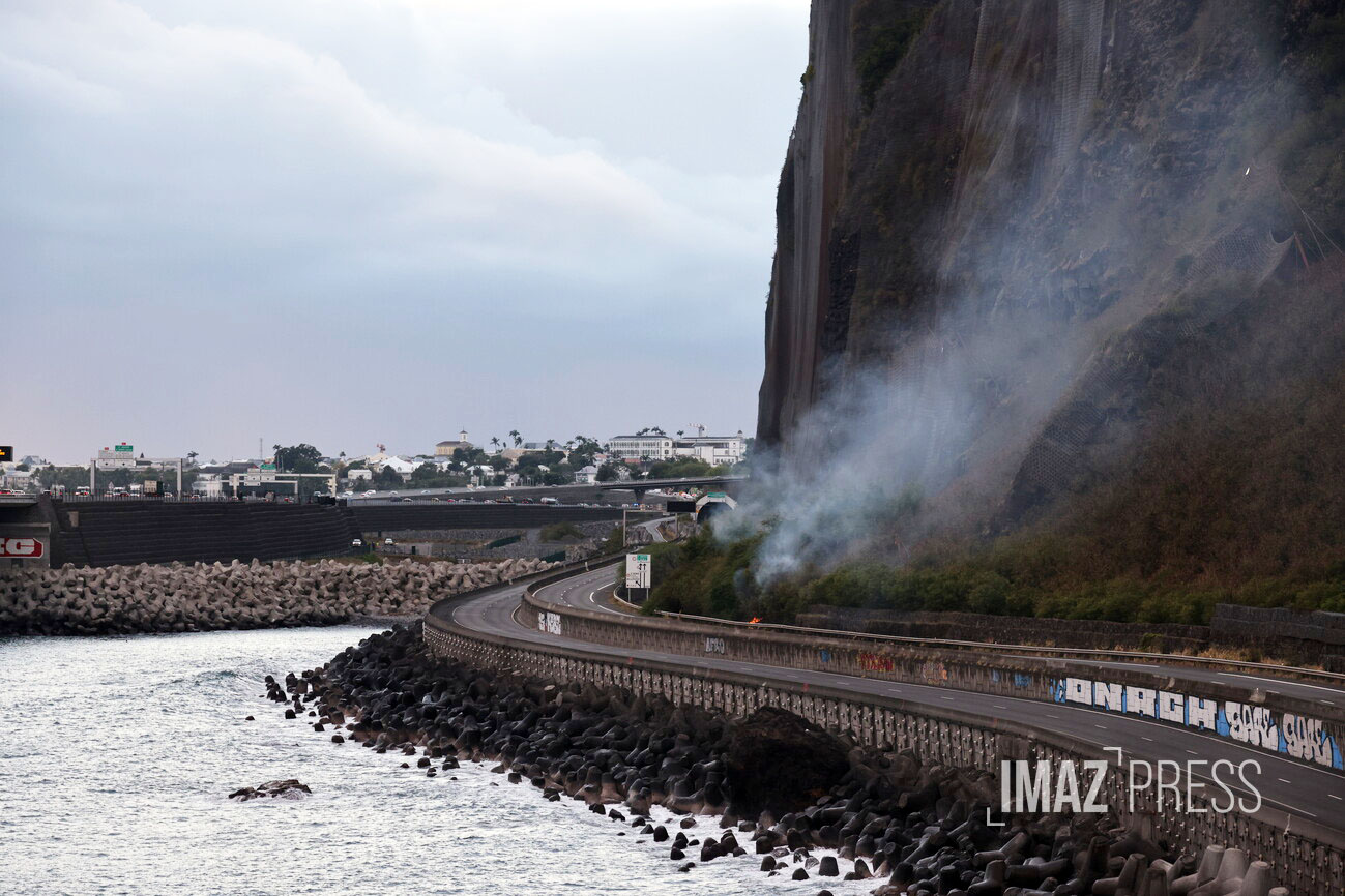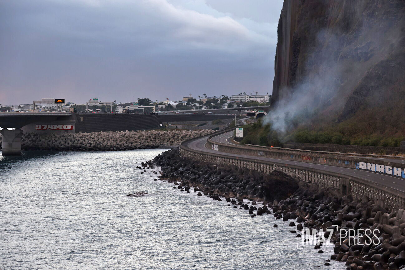 Un incendie a éclaté dans la falaise au-dessus de la portion fermée de la route du littoral très tôt ce mardi mardi 20 août 2024. Le feu est sans danger pour les automobilistes. Il se situe entre les potences et le tunnel du Cap Bernard, une portion de route hors d'usage depuis la mise en service de la NRL. La zone du sinistre est inaccessible à pied par les pompiers. Un intervention d’hélicoptères bombardiers d'eau pourrait être décidée (Photo d'illustration rb/www.imazpress.com)
