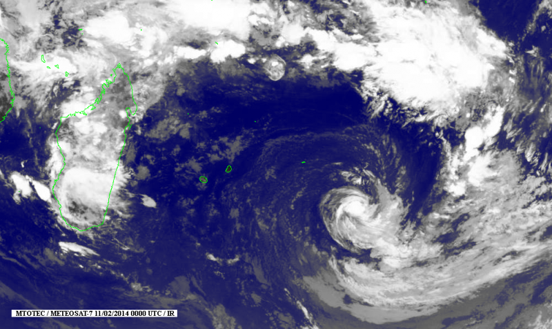Rétrogradée au stade de dépression subtropicale, Fobane est ce mardi 11 février 2014 à 1130 kilomètres à l'est-sud-est de La Réunion (24.8 Sud / 66.2 Est). A 16 heures, le système se déplaçait vers le sud-sud-ouest à une vitesse de 17 km/h. Météo France ne prévoit aucune menace cyclonique pour les 72 prochaines heures. (image satellite Mtotec.com)