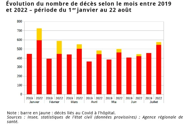 Entre janvier et août 2022, la mortalité augmente très fortement à La Réunion par rapport à la même période en 2019 : 4 300 décès du 1 janvier au 22 août en 2022 contre 3 170 en 2019, soit une augmentation de + 35 %. Celle-ci est très largement supérieure à la moyenne nationale (+ 8 %) ou même qu’aux Antilles (entre 16 % et 19 % selon les départements).