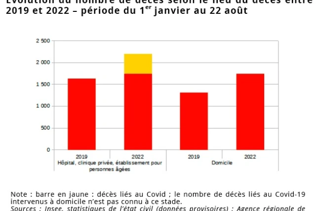 Ainsi, parmi les décès dont le certificat fait mention de la Covid-19 entre mars 2020 et février 2022 à La Réunion, une comorbidité était indiquée pour 55 % d’entre eux. Les décès à domicile représentent quatre décès sur dix. Leur nombre augmente également fortement entre 2019 et 2022 : 1 750 du 1 janvier au 22 août 2022, soit 430 de plus que trois ans plus tôt.