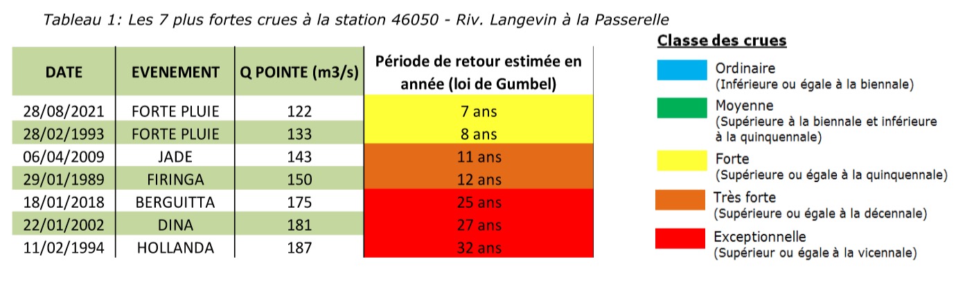 Le tableau ci-dessous représente les 7 plus fortes crues observées sur la Rivière Langevin à la Passerelle depuis 1987.