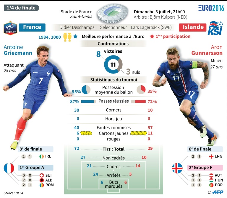 Ce match sent le piège à plein nez pour l'équipe de France: les Bleus doivent éviter une sortie humiliante de leur Euro, dimanche en quart de finale face à la surprenante Islande (21h00, 23h00 heure de La Réunion), qui a ébahi la planète football en faisant chuter l'Angleterre.