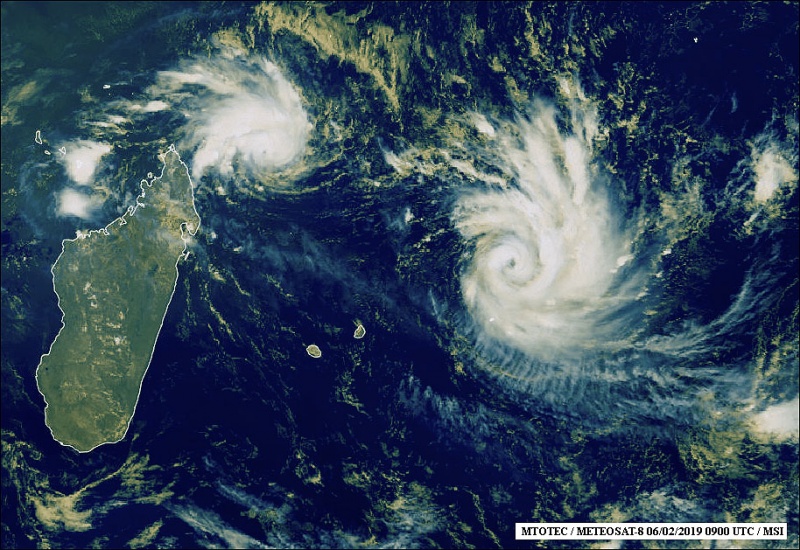Les deux systèmes dépressionnaires continuent de se développer au nord de La Réunion ce mercredi 6 février 2019. Forte tempête tropicale, Funani se stabilise et reste à 16h, à 985 km de nos côtes dans un secteur Est-Nord-Est. Elle se déplace vers le sud-sud-est à 11 km/h. L'ex système n°9, baptisé Gelena s'est rapidement intensifié, passant de tempête tropicale modérée ce mercredi matin à forte tempête à 16h. Lee système se situe à 970 km de nos côtes dans le secteur nord-nord-ouest. Elle se déplace vers le sud-est à 4 km/h. Ces deux systèmes ne représentent aucune menace pour La Réunion dans les trois prochains jours. Pour Rodrigues, La situation est à suivre de très près, les deux phénomènes devraient transiter dans son secteur. L'île est d'ailleurs passée en Alerte II. (Image satellite: www.mtotec.com)