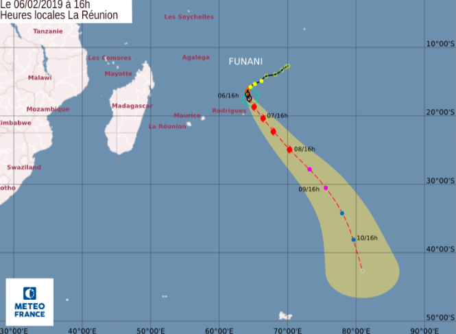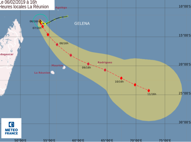 Position le 06 février à 16 heures locales Réunion: 17.4 Sud / 64.4 Est.