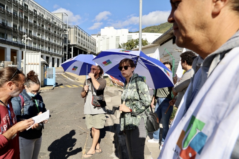 A ses côtés pour cette visite se tient notamment Huguette Bello, Présidente de Région, Philippe Naillet, député de la 1ère circonscription de La Réunion. Bertrand Guihard, chef du pôle des urgences CHU Nord, lui explique le fonctionement de la nouvelle plateforme d'appel du Samu.