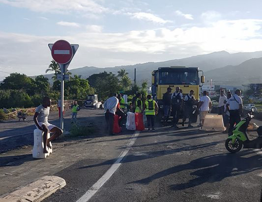 Un peu avant 7 heures ce mercredi 30 janvier 2019, une dizaine de gilets jaunes s'étaient installés au Rond-point du Sacré-Coeur, sur la bretelle de sortie dans le sens Saint-Denis/Saint-Paul. Ils ont entravé la route avec des blocs en plastique, pendant un peu plus de 40 minutes, les forces de l'ordre étaient sur place. "Ils ont levé le barrage d'eux mêmes", indique la Direction régionale des routes (DRR). Ce barrage n'a pas généré de bouchons. (Photo Radar 974/Facebook)