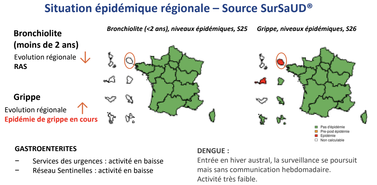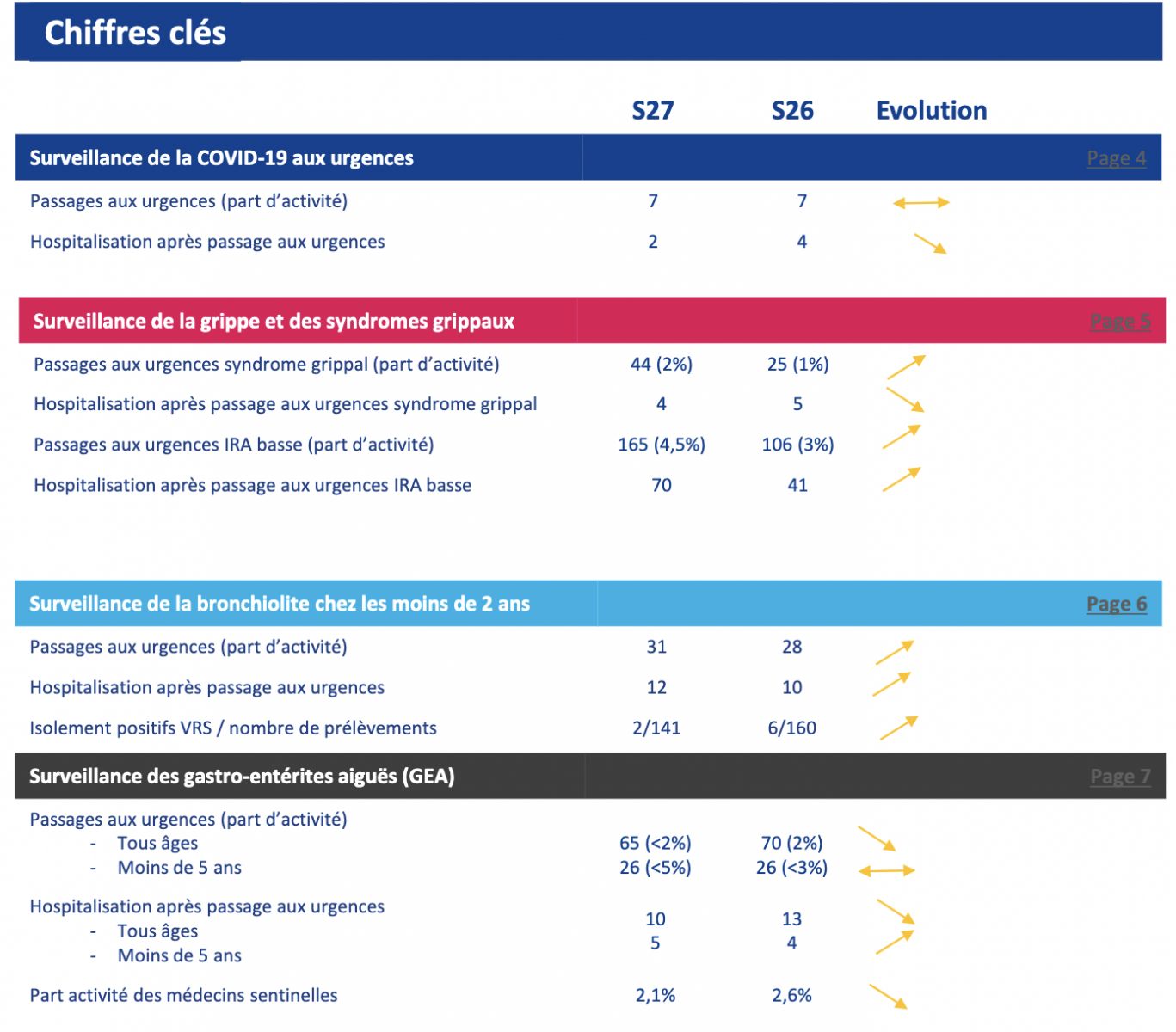 Le taux de participation du réseau de médecins sentinelles était de 82 % avec 2 362 consultations de ville déclarées. En S27, les consultations pour IRA restent toujours à un très niveau élevé (7,7%) en lien avec la circulation virale de la grippe de type B.