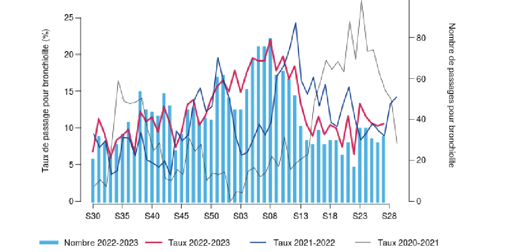 La part pour bronchiolite de l’activité globale pour les moins de deux ans était de 11%.