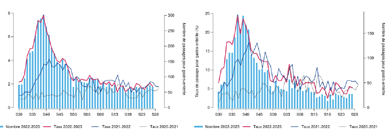 Les passages aux urgences pour motif de gastro-entérite chez les enfants de moins de 5 ans demeurait stable (n=26) comparé à la, au même titre que pour les hospitalisations (5 en S27 vs 4 en S26). En S27, la part de l’activité globale pour gastro-entérite chez les moins de 5 ans restait stable à 5%.